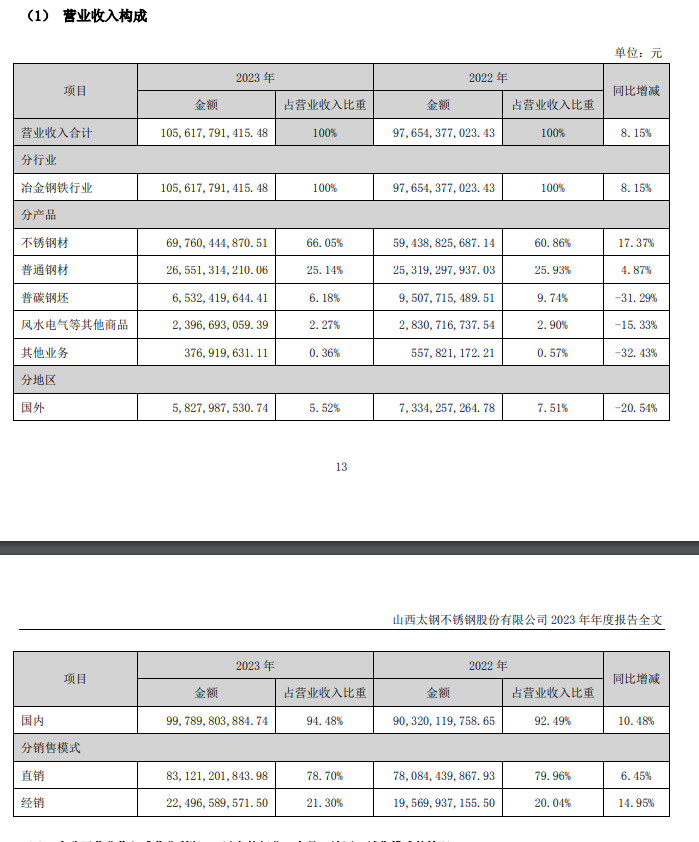 4月26日,太鋼不銹(000825)發(fā)布2023年年度報(bào)告,2023年實(shí)現(xiàn)營業(yè)收入1056.18億元,同比增長8.15%;實(shí)現(xiàn)凈利潤-10.81億元;基本每股收益-0.190元;加權(quán)平均凈資產(chǎn)收益率ROE為-3.16%;經(jīng)營活動(dòng)產(chǎn)生的現(xiàn)金流量凈額為26.66億元,同比下降47.83%;投資活動(dòng)產(chǎn)生的現(xiàn)金流量凈額為-20.07億元;籌資活動(dòng)產(chǎn)生的現(xiàn)金流量凈額為-33億元。