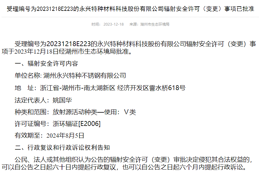 12月18日,湖州永興特種材料科技股份有限公司輻射安全許可(變更)事項(xiàng)獲批準(zhǔn)。