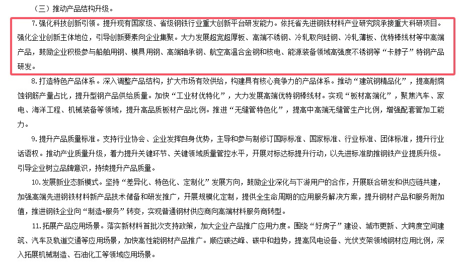 其中,在《河南省鋼鐵產(chǎn)業(yè)提質(zhì)升級(jí)行動(dòng)計(jì)劃》中提到將強(qiáng)化科技創(chuàng)新引領(lǐng)。提升現(xiàn)有國(guó)家級(jí)、省級(jí)鋼鐵行業(yè)重大創(chuàng)新平臺(tái)研發(fā)能力。依托省先進(jìn)鋼鐵材料產(chǎn)業(yè)研究院承接重大科研項(xiàng)目。強(qiáng)化企業(yè)創(chuàng)新主體地位,引導(dǎo)創(chuàng)新要素向企業(yè)集聚。大力發(fā)展超寬超厚板、高端不銹鋼、冷軋取向硅鋼、冷軋薄板、優(yōu)特棒線材等中高端產(chǎn)品,鼓勵(lì)企業(yè)積極參與船舶用鋼、模具用鋼、高端軸承鋼、航空高溫合金鋼和核電、能源裝備領(lǐng)域高強(qiáng)度不銹鋼等“卡脖子”特鋼產(chǎn)品研發(fā)。