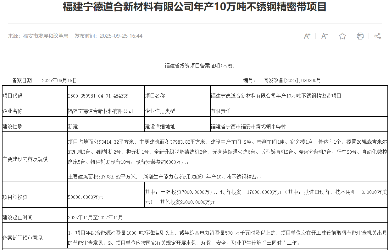 2025年9月15日,福建寧德道合新材料有限公司年產(chǎn)10萬噸不銹鋼精密帶項(xiàng)目獲備案。